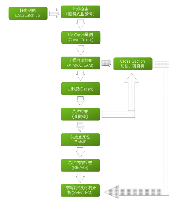 半導體器件的失效分析流程,國際國內公認的方法是從非破壞性試驗手段到破壞性試驗手段